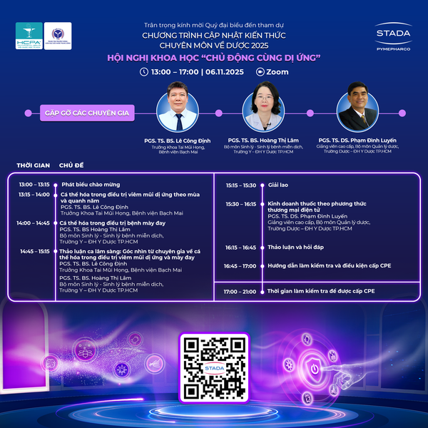 Cập nhật kiến thức thực hành về viêm mũi dị ứng, mày đay và các bệnh lý hô hấp thường gặp cùng các chuyên gia từ Bệnh viện Bạch Mai và Đại học Y Dược TP. Hồ Chí Minh, giúp cộng đồng dược sĩ nâng cao năng lực chuyên môn trong điều trị và chăm sóc sức khỏe hô hấp.