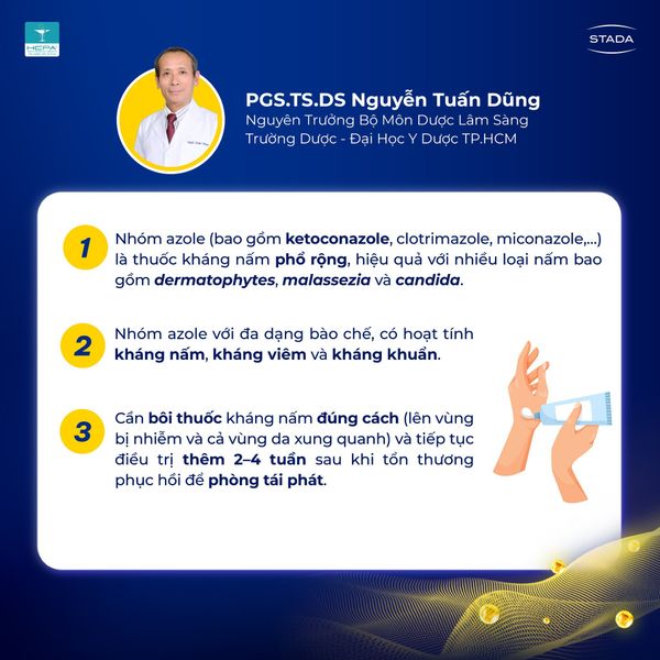 💊 PGS.TS.DS Nguyễn Tuấn Dũng, Nguyên Trưởng Bộ môn Dược lâm sàng – Đại học Y Dược TP.HCM, nhấn mạnh: “Nhóm thuốc azole (như ketoconazole) có phổ kháng nấm rộng, hiệu quả trên nhiều chủng nấm gây bệnh khác nhau, đồng thời có đặc tính kháng viêm và kháng khuẩn”.