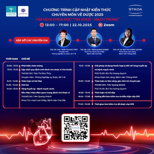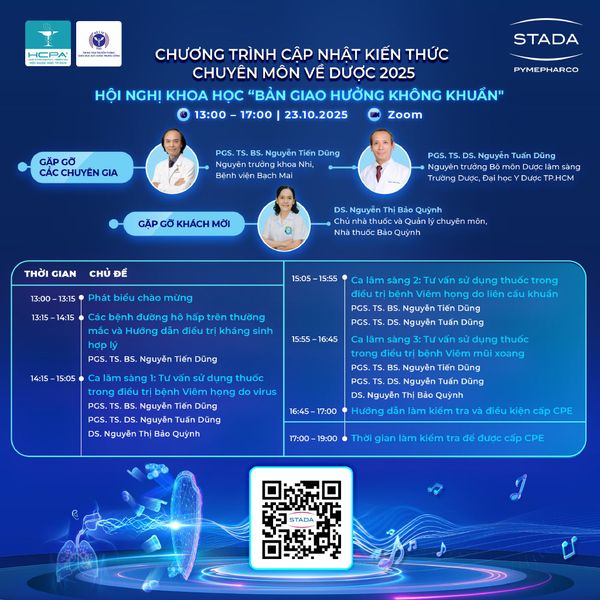 🎓 Tuần này, STADA Academy 2025 chính thức trở lại với hai chương trình Hội thảo khoa học trực tuyến, được Trung tâm Truyền thông Giáo dục Sức khỏe Trung ương – Bộ Y tế (T5G-MOH) bảo trợ nội dung và Hội Dược học TP. Hồ Chí Minh (HCPA) hỗ trợ cấp chứng chỉ CPE cho các học viên đủ điều kiện.